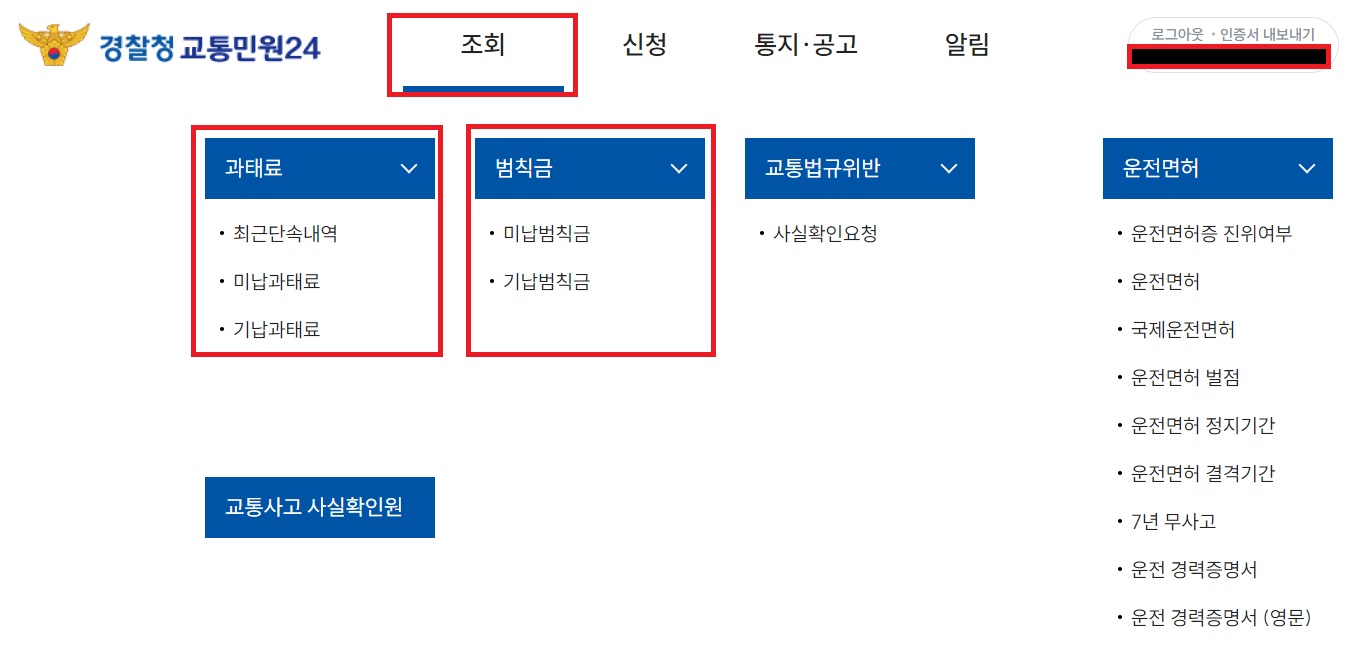2) 조회메뉴를 클릭하면 과태료 및 범칙금 등의 항목이 나옵니다.