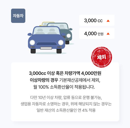 📌 소득인정액 : 소득평가액과 재산의 소득환삭액을 평가해 합산한 금액 ✔ 소득인정액 = 소득평가액 + 재산의 소득환산액 ✔ 소득평가액 = {0.7 X (근로소득 - 108만원)} + 기타소득 ✔ 재산의 소득환산액 = [{일반재산 - 기본재산액*) + (금융재산 - 2,000만원) - 부채} X 재산의 소득환산율/12월] + P** * 기본재산액 : 대도시 및 특례시 1억3,500만원, 중소도시 8,500만원, 농어촌 7,250만원 ** P : 고급자동차(3000cc 이상 또는 4,000만원 이상) 및 고급회원권(골프, 승마, 콘도 등)의 가액으로 월 100%의 소득환산율을 적용 |