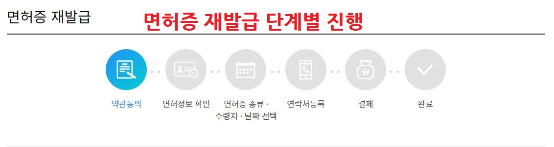 ④ 면허증 재발급 절차를 단계별로 진행합니다.(약관동의→면허정보 확인→면허증 종류·수령지·날짜 선택→결제→완료)