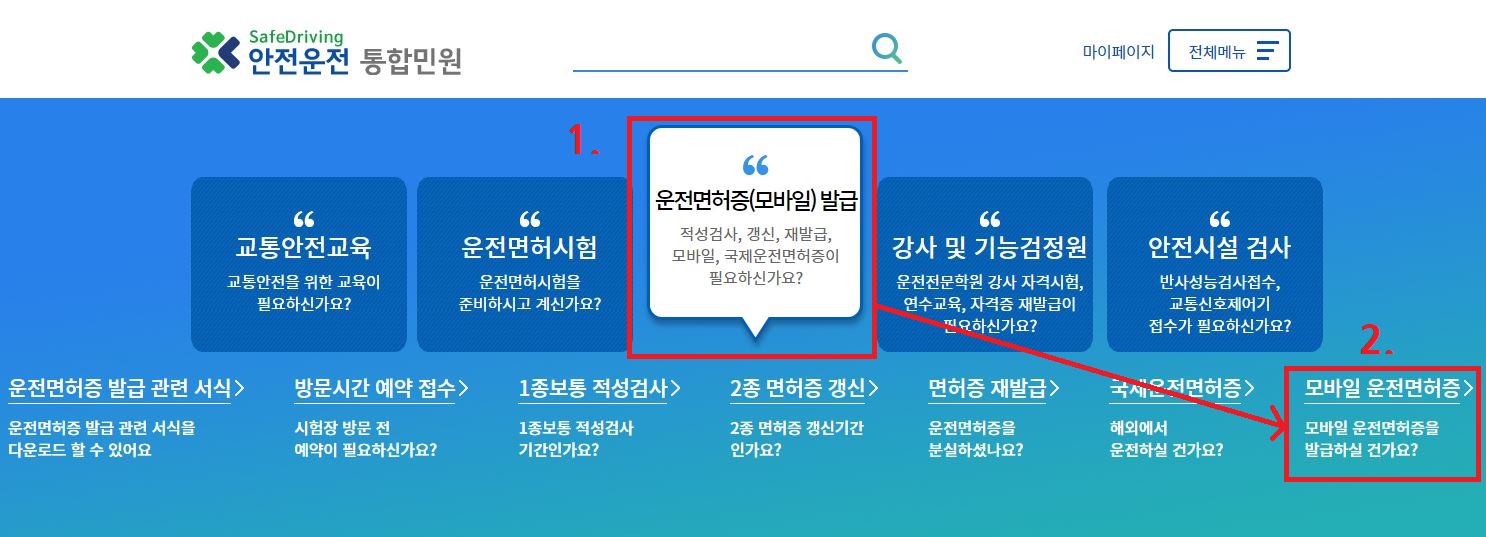 ① 안전운전통합민원 홈페이지 접속해 운전면허증(모바일) 발급→ 모바일 운전면허증 메뉴를 클릭합니다.