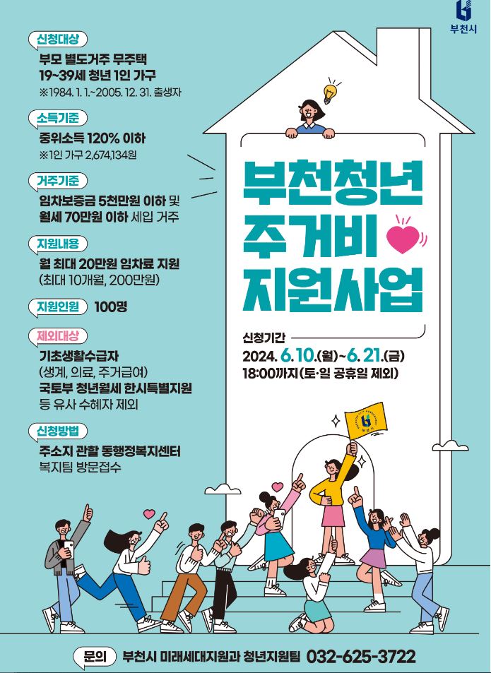경기 부천시는 청년 지원방안으로 6월 10일부터 21일까지 지역 내 거주하는 청년을 대상으로 주거비 지원 신청을 받습니다.