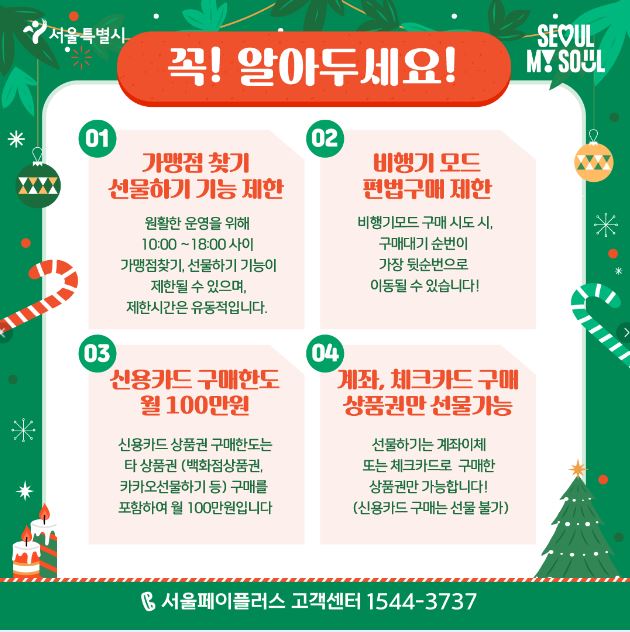 | 발행조건은 다음과 같습니다. - 발행일정 : 짝수년생 2023.12.5.(화) 10:00 / 홀수년생 2023.12.2.(화) 14:00 - 발행규모 : 350억원 (오전·오후 각 175억원) - 할인율 : 7% - 구매한도 : 월 30만원 (보유한도 100만 원) * 보다 많은 시민들이 사용할 수 있도록 구매한도 조정 * 보유한도 내 <선물하기> 가능 - 유효기간 : 발행일로부터 5년 - 구매처 : 서울페이 / 신한SOL / 티머니페이 / 머니트리 / 신한 pLay - 서울페이플러스 고객센터 : 1544-3737 |