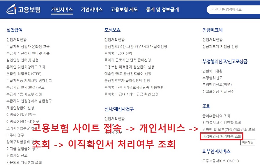 2. 고용보.험 사이트를 통해 이직확인서 처리 완료 확인 (개인서비스 → 조회 → 이직확인서 처리여부 조회)