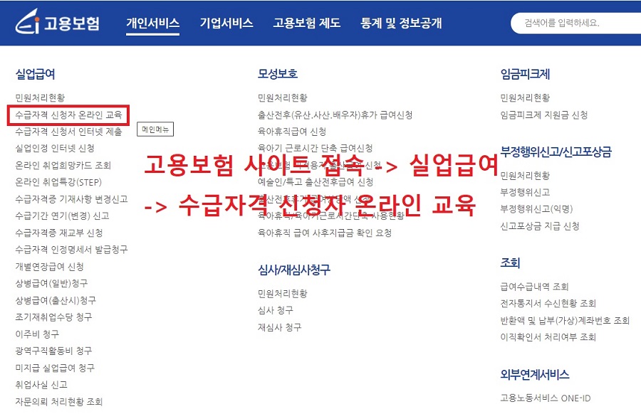4. 수급자격 신청자 온라인 교육 수강 (개인서비스 → 실업급여 → 수급자격 신청자 온라인 교육)