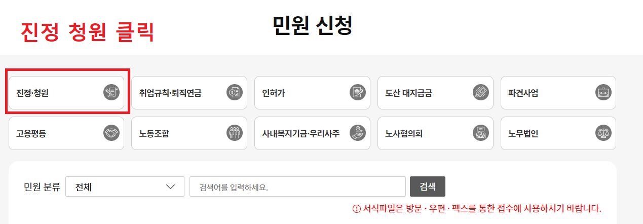 - '노동포털' 홈페이지에서 [마이페이지→나의민원→로그인→'진정취하'] 메뉴 클릭
