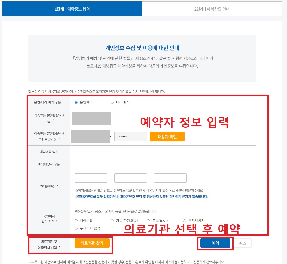 5) 예약정보 입력 단계에서 예약 대상자 확인→의료기관 찾기 후 의료기관 및 접종일·시을 선택합니다. 이후 예약 버튼을 클릭하면 코로나19 예방접종 신청이 완료됩니다.