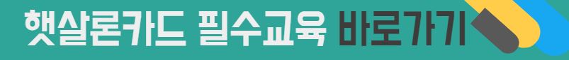 ◆ 서민금융진흥원 금융교육포털에서 '햇살론카드 이용자 교육'을 필수 3과목 이상 수강해야 합니다. 이수여부는 전산으로 자동 체크되며 미이수시에는 보증약정 체결이 불가능하니 꼭 교육을 받으시기 바랍니다.