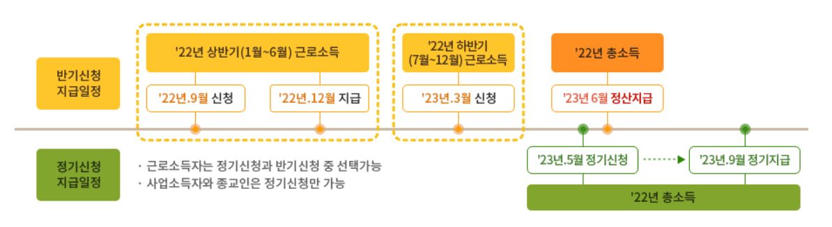 근로소득만 있는 자(배우자 포함)는 정기·반기신청 중 선택할 수 있으나, 근로·사업·종교인 소득이 같이 있다면 정기 신청만 가능합니다.