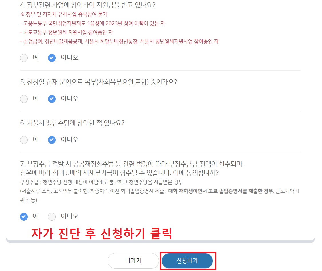 2. 청년수당 신청란에서 신청 전 자가진단 실시![]() |