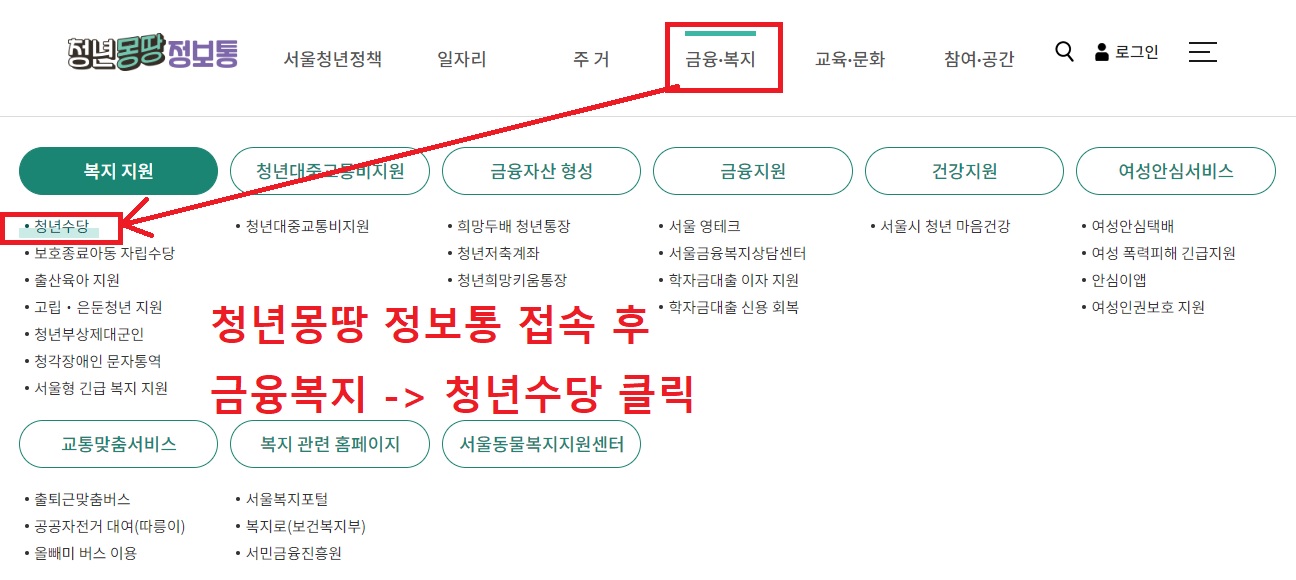 1. 청년몽땅정보통 접속 후 금융복지 -> 청년수당 클릭![]() |