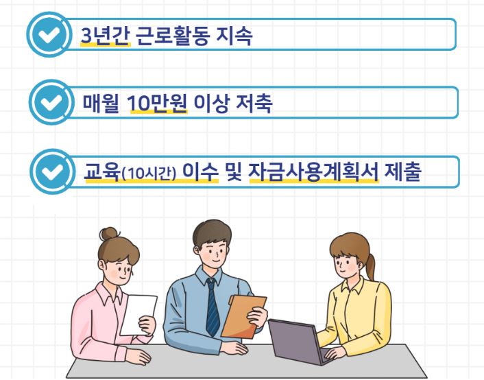 [ 매월 10만원 이상 저축 + 3년간 근로활동 지속 + 교육이수 + 자금사용계획서 = 근로소득장려금 360만 원 지원 ]