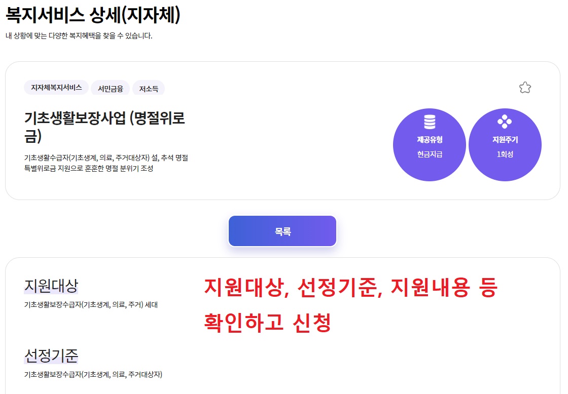 4) 명절지원금 지원대상, 선정기준, 서비스 내용, 신청방법 등을 확인하시고 신청하시면 됩니다.