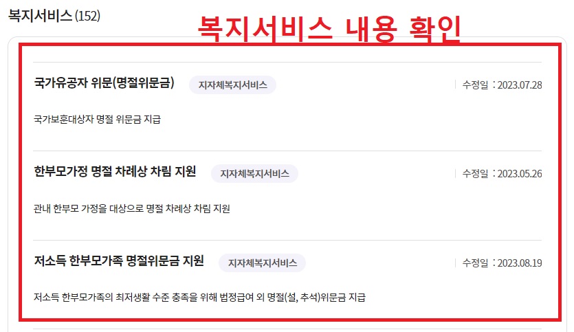 3) '복지서비스' 메뉴에 명절 지원금 내용을 확인하고 본인에게 해당되는 내용을 클릭합니다.