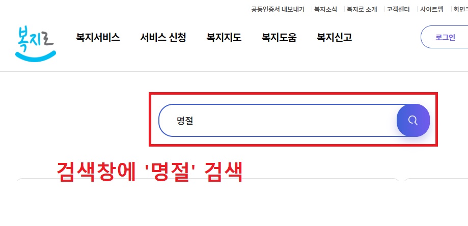 2) 복지로 홈페이지 검색창에 '명절'이라는 키워드로 검색합니다.