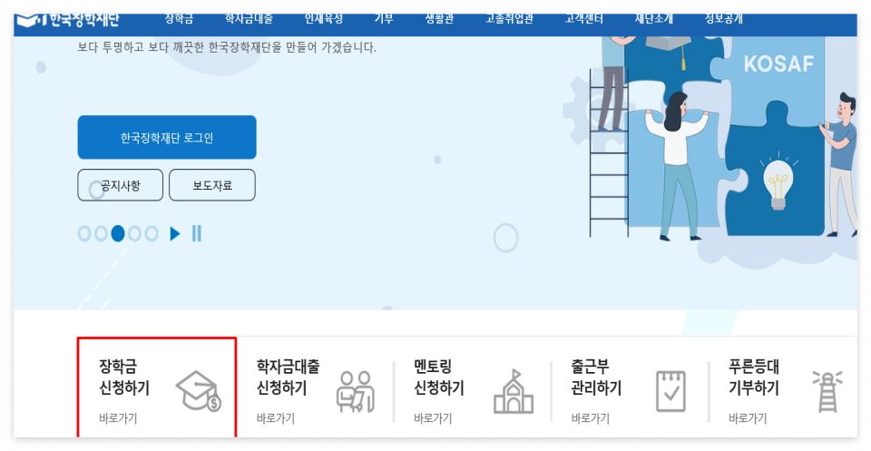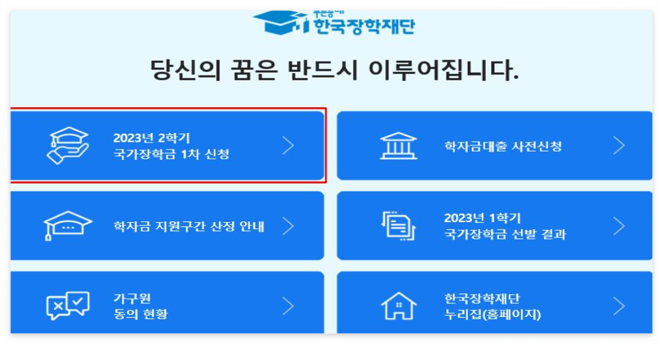 1. 한국장학재단 홈페이지 접속 후 '2023년 2학기 국가장학금 1차 신청' 클릭