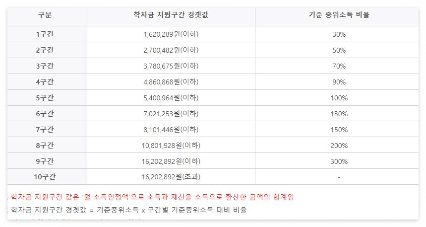 학자금지원 대상자 선정을 위하여 소득·재산 조사를 통해 산정한 학생 가구의 소득인정액을 기준으로 구간을 정하는 것입니다. 이 지원구간 기준으로 어느 정도 지원이 되는지 확인할 수 있습니다.