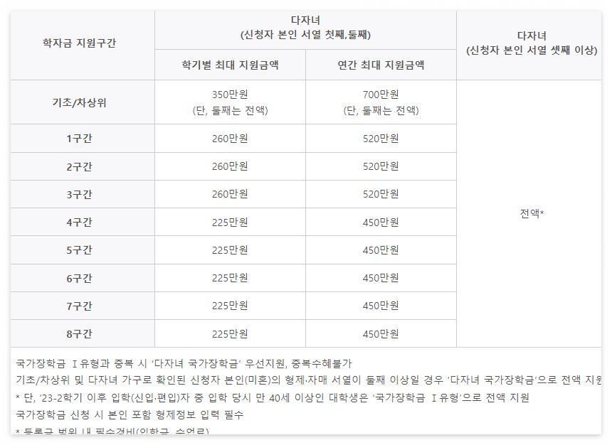 | 📌 지원자격 대한민국 국적을 소지한 국내대학의 학자금 지원 8구간 이하, 다자녀 가정의 가구원인 대학생 (미혼에 한함)이며, 해당학기 국가장학금 신청절차를 완료하여 소득 수준이 파악된 학생 ※ 단, '23. 2학기 이후 입학(신입·편입) 자는 입학 당시 만 39세 이하인 경우에 한함(만 40세 이상은 국가장학금 I 유형 지원) ※ 다자녀 가구(대한민국 국적 자녀 3명 이상)의 모든 자녀에게 지원 📌 대상대학, 소득기준, 심사기준 국가장학금 I 유형(학생직접지원형)과 동일 📌 지원금액 2023년 정부 예산(안) 기준으로 아래의 표를 참고 |