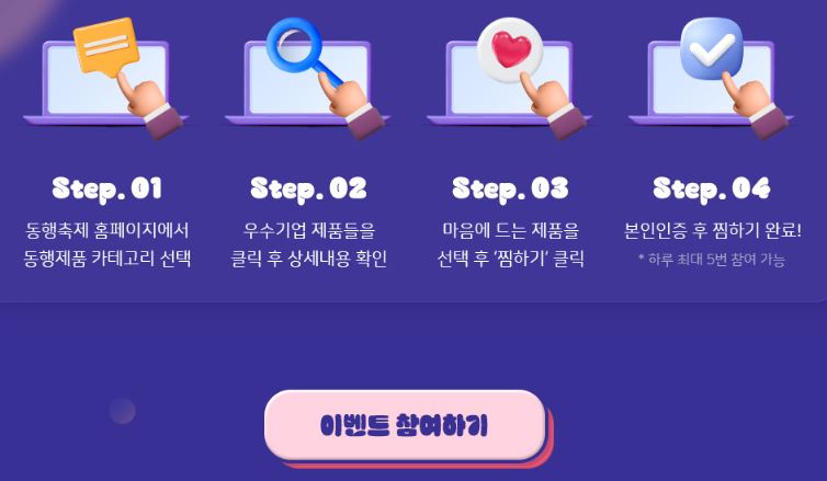 ■ 축제기간 중 동행축제 홈페이지에서 마음에 드는 동행제품 선택 후 '찜하기' 후 본인인증만 하시면 이벤트에 참여가 가능합니다.