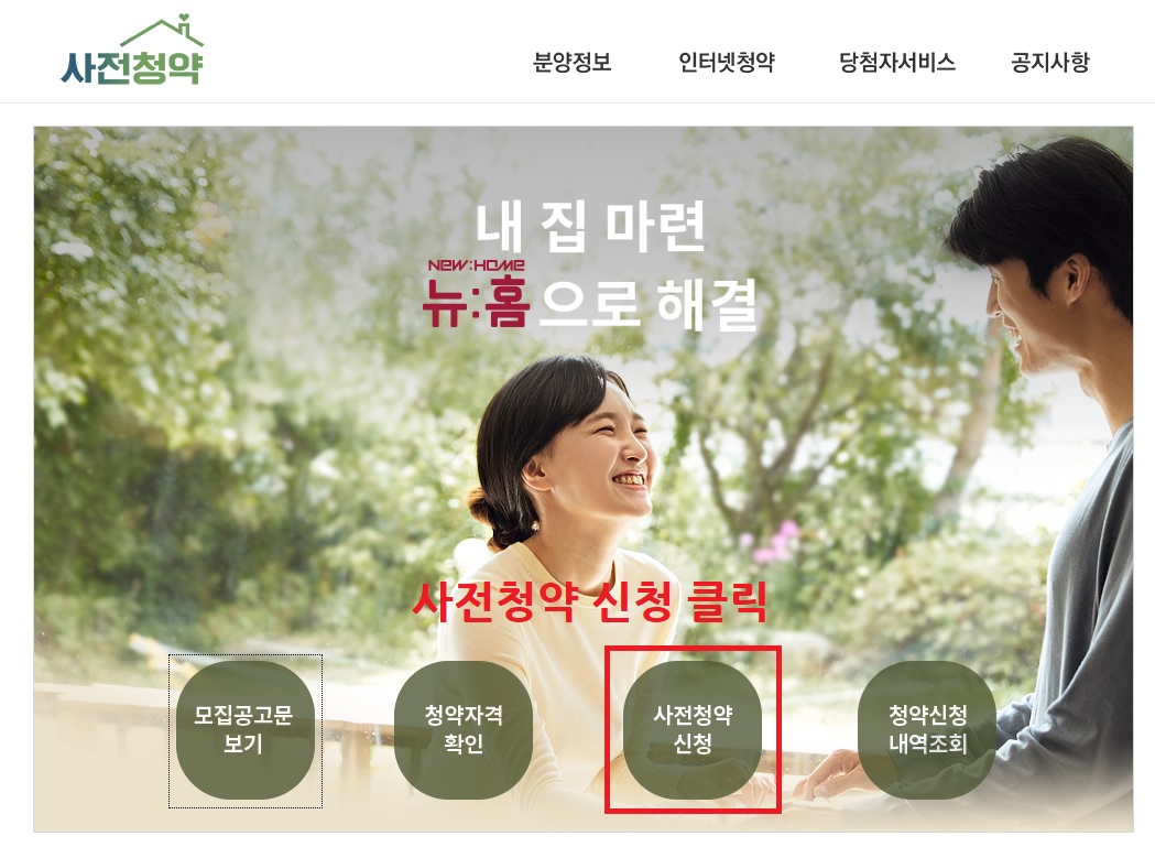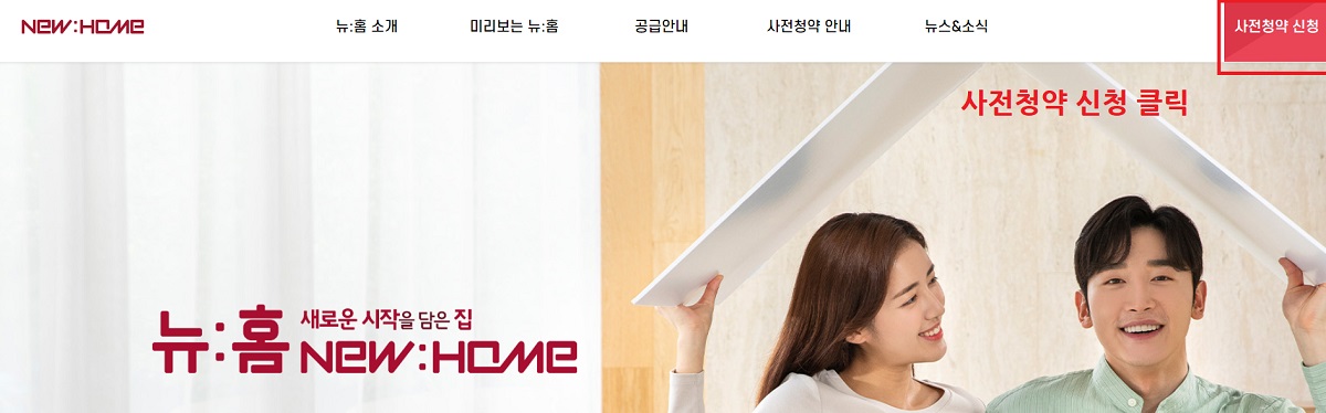2. 뉴홈 홈페이지에서 '사전청약 신청'을 클릭합니다.