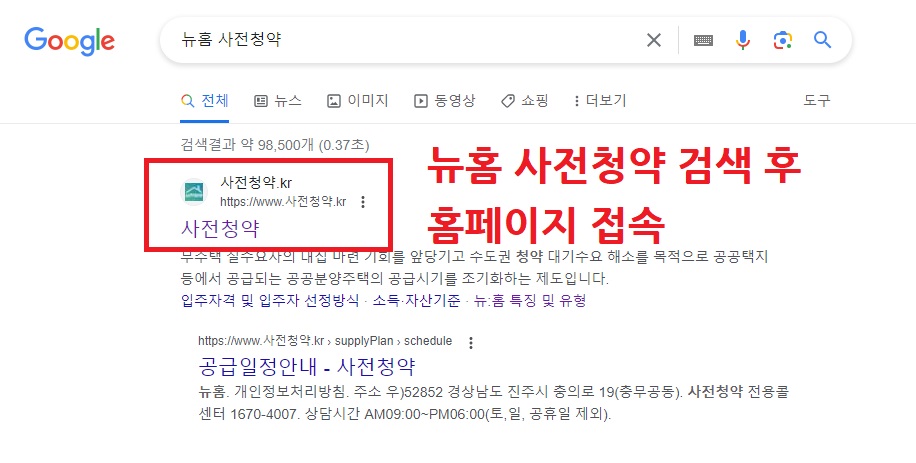 1. 검색포털에 '뉴홈 사전청약' 검색 후 홈페이지에 접속합니다.