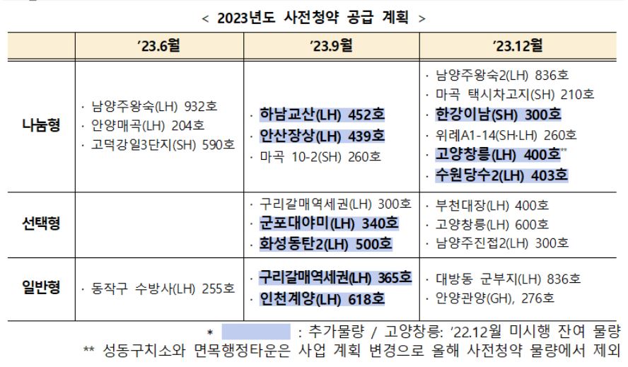 2023년도 사전청약 공급 계획은 아래의 그림을 참고하시기 바랍니다.