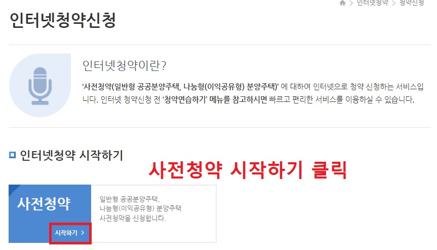 5. 인터넷청약신청 사전청약 시작하기를 클릭합니다.