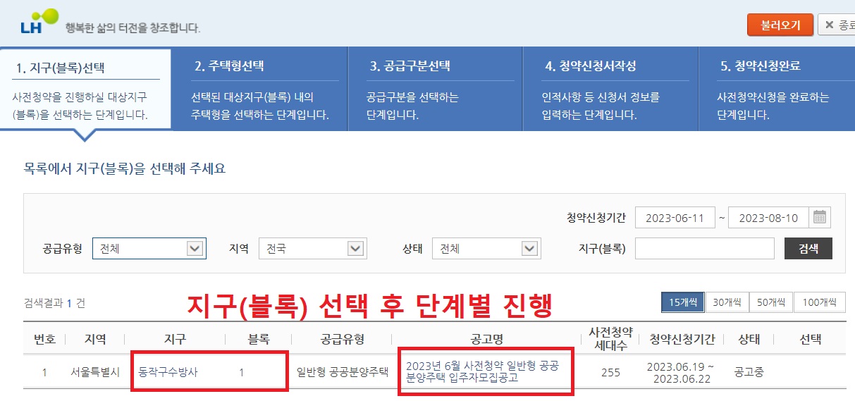 6. 모집공고 확인 및 지구(블록) 선택 후 주택형선택→공급구분선택→청약신청서작성→청약신청완료 단계별 진행하시면 됩니다.