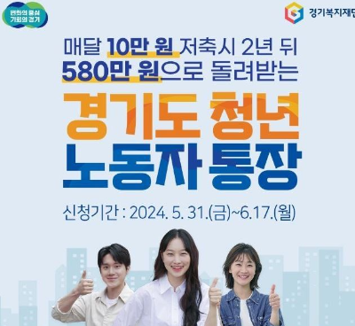 청년 노동자 통장은 2년간 근로를 유지하면서 매달 10만 원씩 저축하면 경기도가 14만 2천 원을 추가 적립해 주는 사업입니다. 2년 후 지역화폐 100만 원을 포함해 총 580만 원을 받을 수 있습니다.
