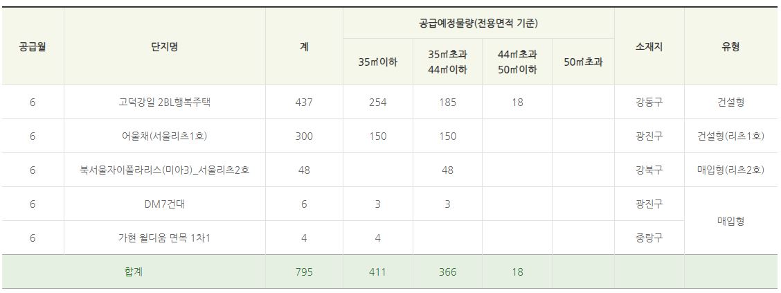 | 고령자, 주거급여수급자 | 재공급단지 | 강동 리엔파크, 가양동 모듈러 행복주택, 방화동 행복주택, 천왕연지마을, 공덕동 크로시티, 서울리츠, 이든채, 용산 센트럴파크 해링턴스퀘어 등 | |