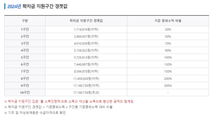 더욱 자세한 학자금 지원 구간은 한국 장학재단 홈페이지에서 모의 계산 시스템을 통해 확인하시기 바랍니다.