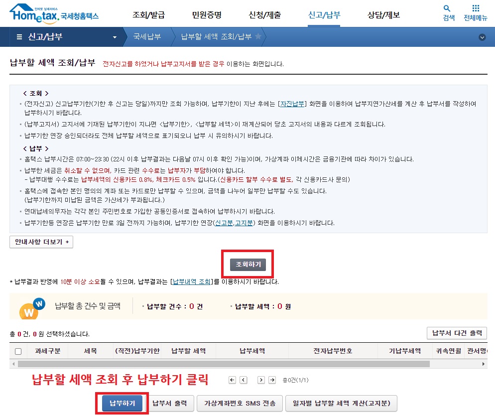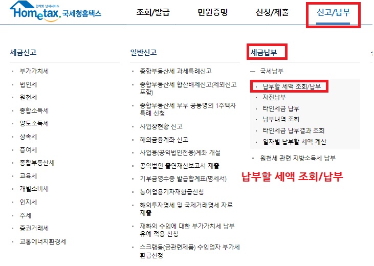 | 🔹 홈택스(www.hometax.go.kr) 전자납부 홈택스 로그인(공동·금융인증서 필수)→신고/납부→세금납부→국세납부→납부할세액 조회납부→납부하기→결제수단선택(계좌이체·간편결제) ![]() ![]() |